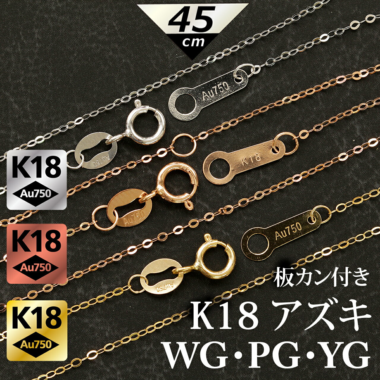 【K18】 K18 プレート付き 40cm 45cm アズキチェーン 板カン付き 小豆 選べる長さ 選べるカラー ホワイトゴールド イエローゴールド ピンクゴールド アズキ 小豆 チェーン 替え