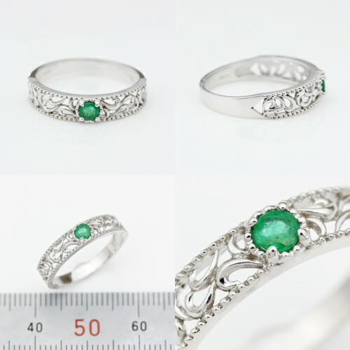 『ジュエリークイーン』ホワイトゴールド(K10WG) エメラルド リング(透かし/ストレート/ラウンド/一粒石/ワンストーン/5月誕生石)【宝石 ジュエリー】【プレゼント】【刻印無料】*