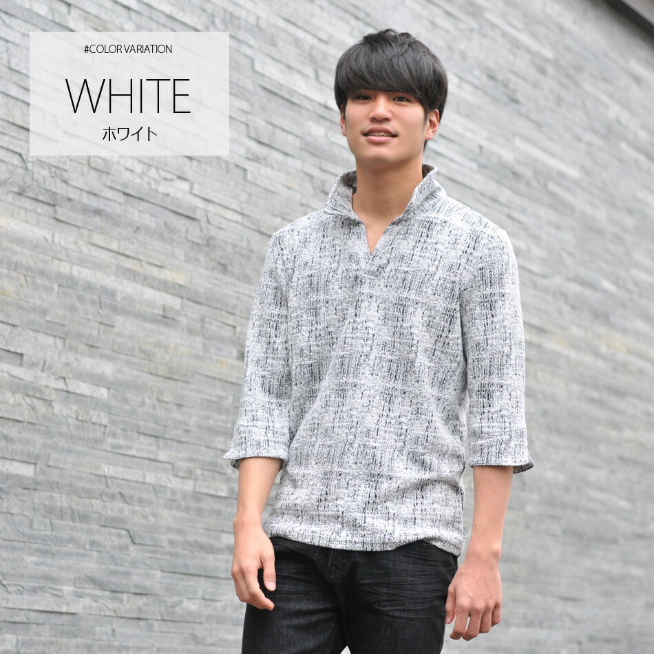 ポロシャツ メンズ イタリアンカラー 7分袖 春夏秋 スキッパー モード系 BITTER系 ビター系 総柄 シンプル ホワイト ネイビー ブラック 白 紺 黒 ジャガード M L XL LL 2L evolution エボリューション