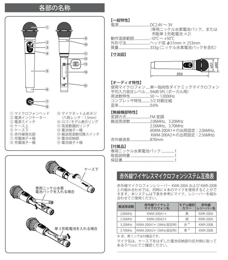 日本製 CSR赤外線ワイヤレスマイクセット 充電式マイク2本組 KWM-200 カラオケ対応