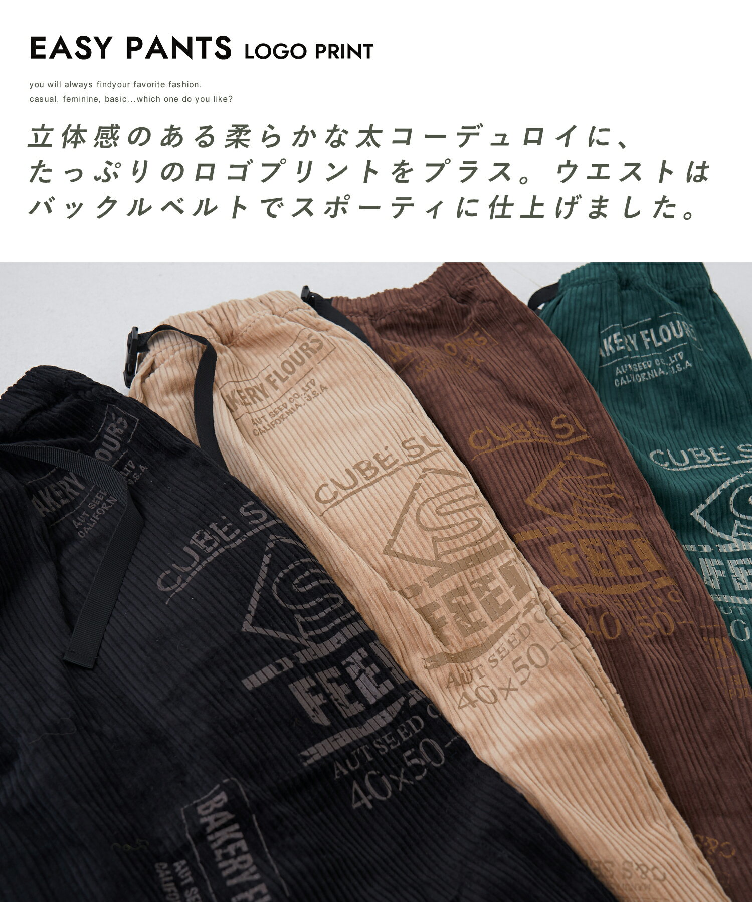 【30%OFF】コーデュロイパンツ / 公式 CUBE SUGAR 6W コーデュロイ ロゴプリント イージーパンツ (4色): アメカジ レディース ボトムス コクーンパンツ ワイドパンツ ウエストゴム カジュアル キューブシュガー