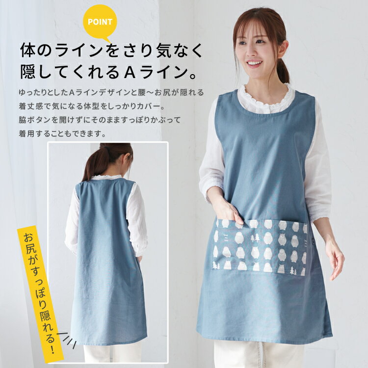 フクロウ柄エプロン ワンピース エプロン ゆったり 綿 コットン シンプル ロング ワンピースエプロン 脇ボタン 保育士 おしゃれ かわいい 母の日 無地 ギフト プレゼント お尻が隠れる M 大きいサイズ