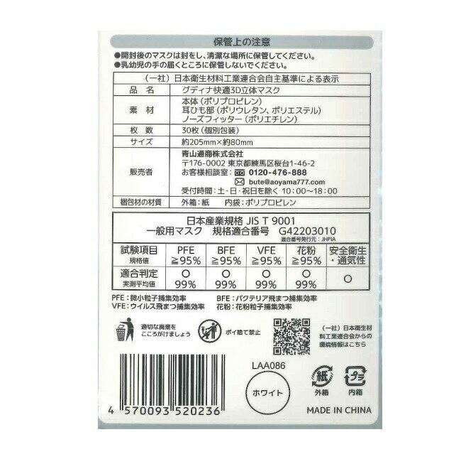 【3個セット】 グディナ 快適3D立体マスク 個包装 ホワイト ふつうサイズ 30枚入×3個セット 【正規品】 立体型マスク