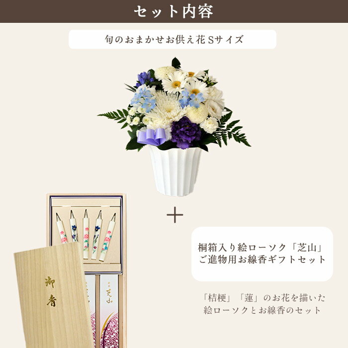 【お供えセット】洋花を使った旬のおまかせ お供え花 Sサイズ &日本香堂「芝山」絵ろうそく+お線香 ご進物用ギフトセット喪中お見舞い 線香 贈答用 進物 お供え お盆 お彼岸 お墓参り 喪中 喪中見舞い 年賀欠礼 生花 FKAA