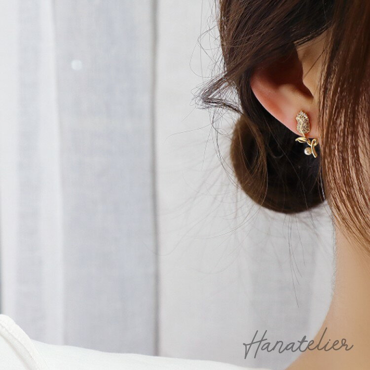 14金メッキ・キュービックジルコニア&パールのチューリップピアス(pie328)ノンホール加工のみOK 14K 韓国アクセサリー 韓国ファッション フラワーピアス-3wr