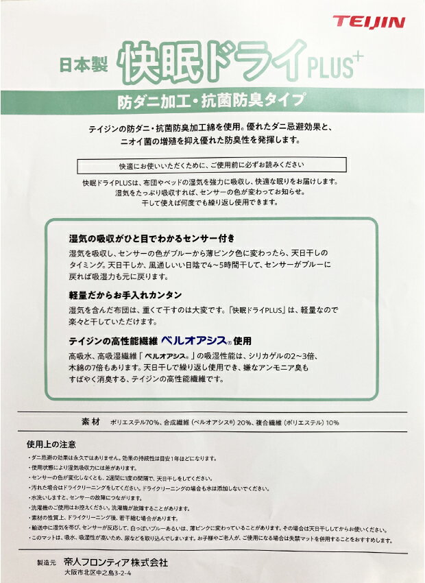 シングル用 90×180cm 除湿シート テイジン 日本製 快眠ドライPLUS+ 防ダニ加工 抗菌防臭タイプ 吸湿センサー付き 吸湿シート 吸湿マット 除湿シート 湿気取り 除湿 敷くだけ