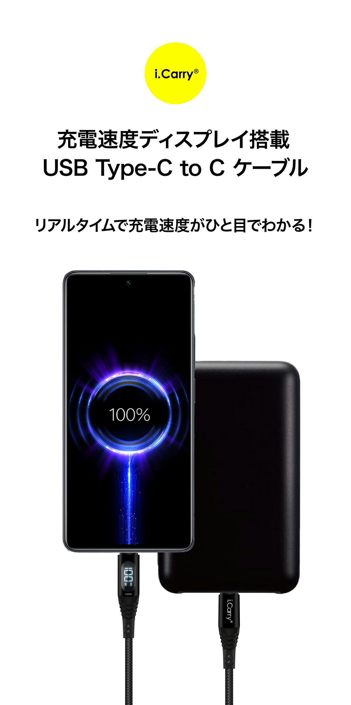 i.Carry USB type-C PD 対応 ケーブル 100W 充電速度ディスプレイ搭載 USB-C 急速充電 タイプC パワーデリバリー 電力表示機能 断線 しにくい ナイロン ケーブル 強化素材 E-Markerチップ内蔵 最大20V/5A デジタル表示 1~2メートル 100cm 200cm データ転送 480Mbps USB2.0