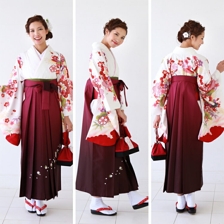 【11/4 20:00〜11/11 1:59まで最大2,000円OFFクーポン】【レンタル】卒業式 袴 レンタル 女 袴セット 卒業式袴セット2尺袖着物&袴フルセットレンタル 安い 「白地に波と鶴 松 竹 梅 桜 綸子」