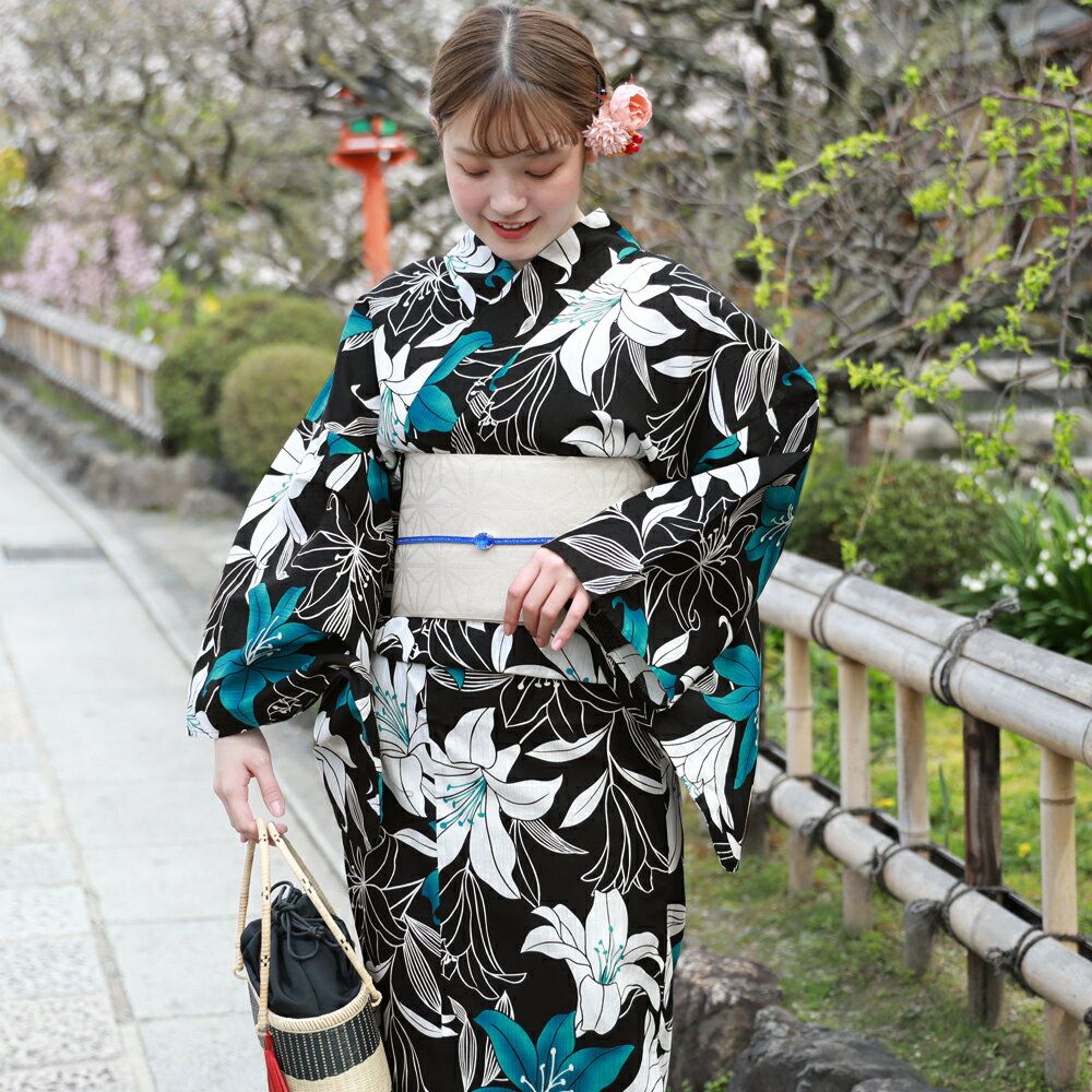 【11/4 20:00〜11/11 1:59まで最大2,000円OFFクーポン】浴衣 セット レディース レトロ 高級変わり織り綿浴衣3点セット「黒地に緑・白の百合」 浴衣 黒 百合 古典柄 大人 モダン しっとり