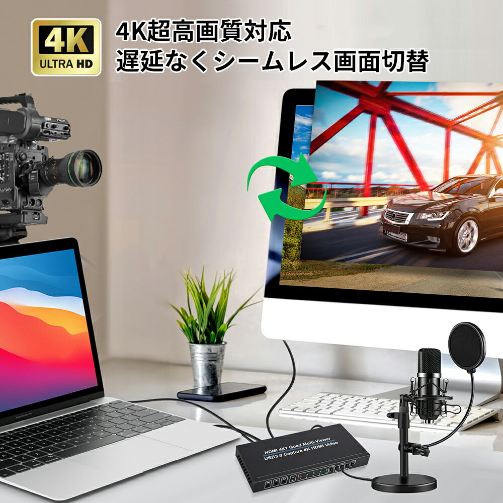 キャプチャー機能付きHDMI画面分割切替器 4入力1出力 4K 超高画質映像出力 ビデオキャプチャー 画面分割表示しながら録画&ライブ配信 リモコンリモート操作可能 HDMI 4×1 Quad Multi-Viewer USB3.0 Capture 4K HDMI Video 日本語取説付き