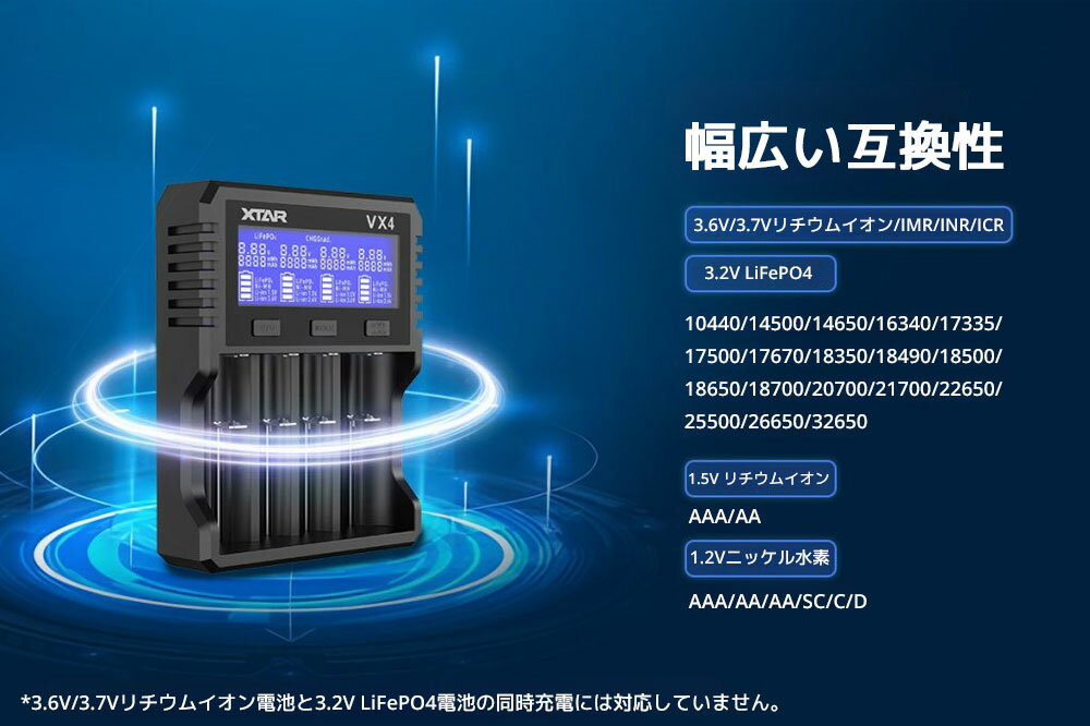 XTAR VX4 リチウムイオン充電器 4スロット PD2.0 QC3.0 急速 高速 充電 エクスター 3.6V 3.7V 1.5V リチウムイオン 1.2Vニッケル水素 IMR INR ICR 3.2V LiFePO4 電池 充電器 電流調整 4本 18650 単三 単四 マルチサイズ 対応 混合充電 過放電解除 ディスプレイ USB充電器