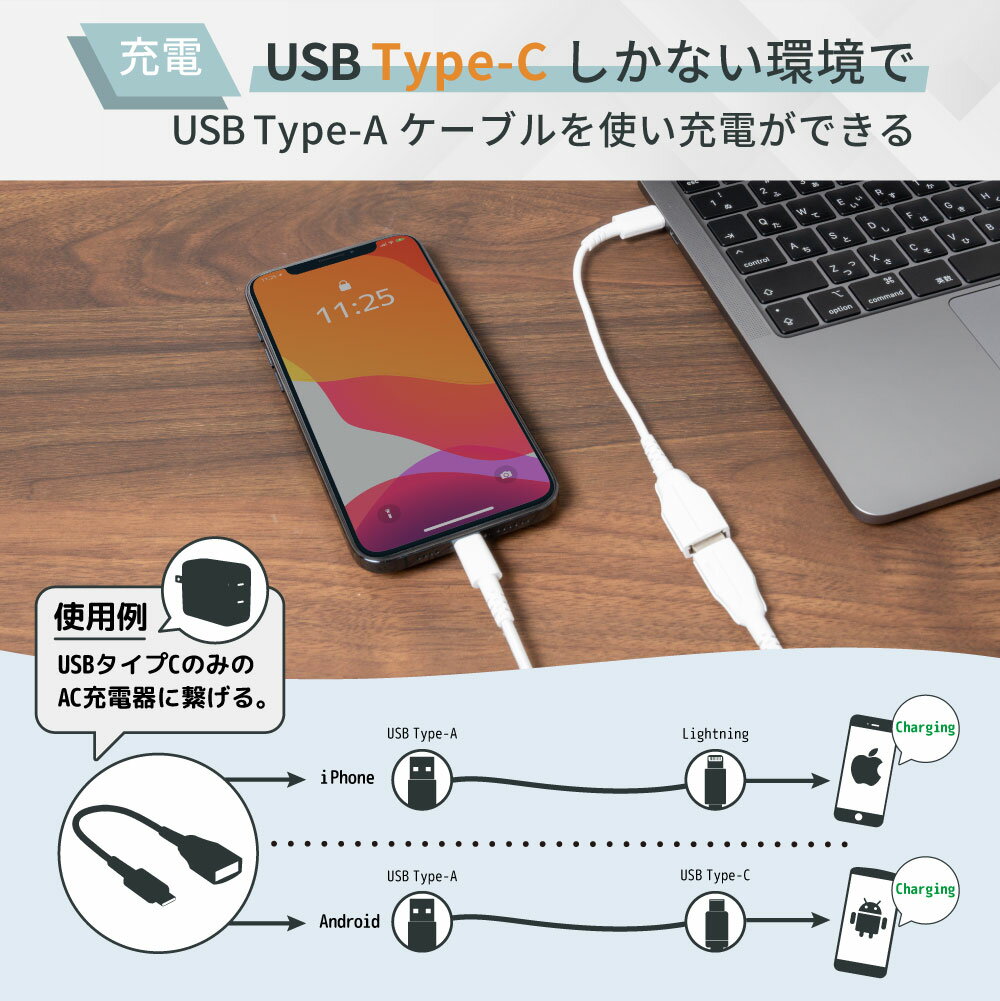 最大3.0A急速充電+データ転送 USB Type-C to USB Type-A 変換ケーブル 20cm