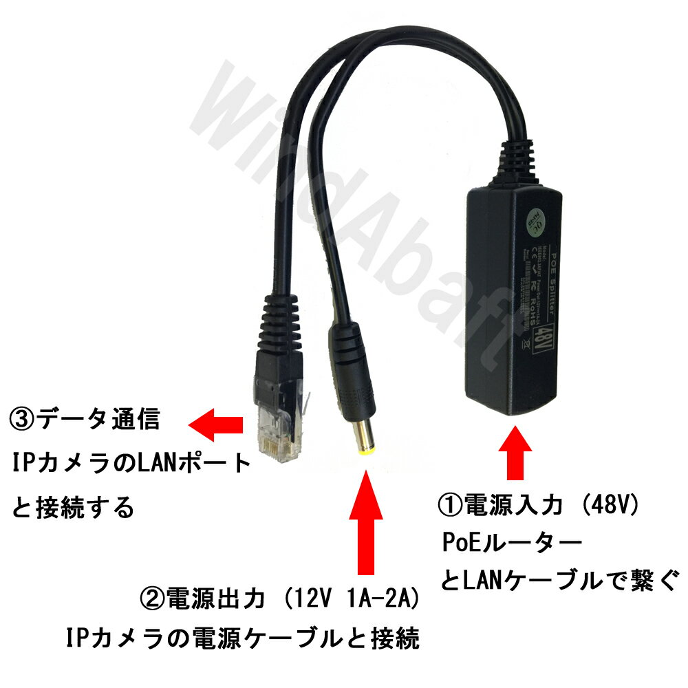 PoE非対応 IPカメラ PoE化 可能 PoE スプリッター IEEE802.3af 準拠 10/100 mbps 入力48V 出力12V 1A PoE非対応IPカメラをPoEルーターと接続・給電が可能 防犯カメラ以外の12V機器にもPoE給電可能! PoEルーター(48V出力)と接続可能 メール便配送可