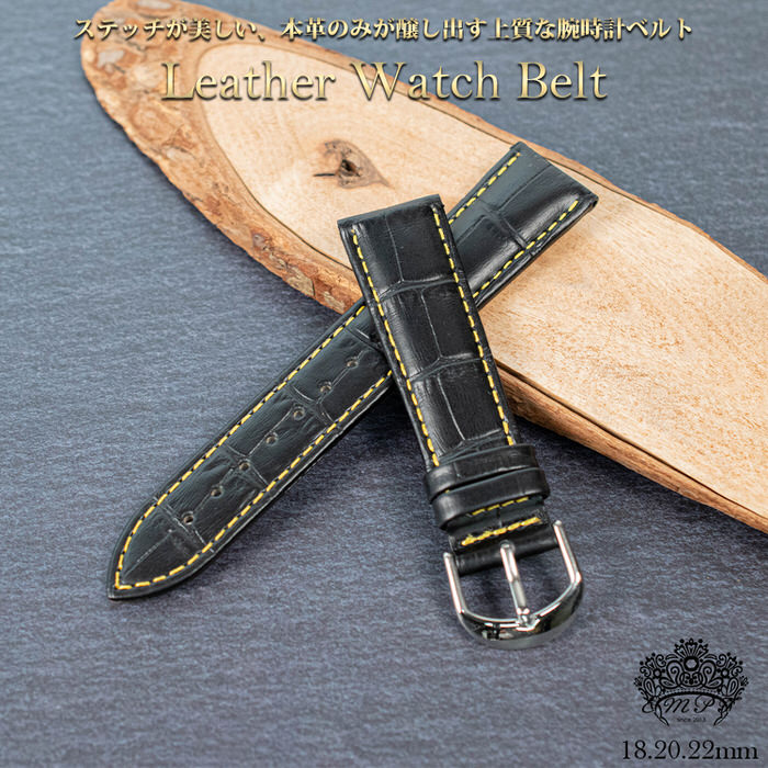 時計 ベルト 腕時計 バンド 黒革 黄 ステッチ | 替えバンド 替えベルト 時計 アクセサリー パーツ バネ棒 バネ棒外し プレゼント メンズ リペア 部品 修理 交換 工具 かっこいい おしゃれ